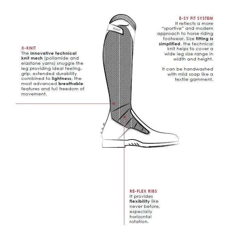 The hot melt technology patches support the leg, providing ideal grip and outstanding tear and wear resistance. EGO7 iconic 3-L spur rest safely secure spurs to the right position. Elegance and captivating Italian design enhance the pioneering style. All elements work seamlessly to combine functionality with aesthetics. The opposed blade profile ensures secure hold to the stirrup while shock absorption is engineered to improve balance and comfort.