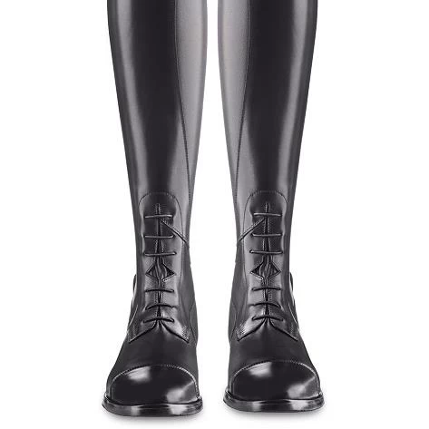 EGO7 Orion, tall riding boots with a modern design and high-end style, lace-up jumping boots made from full grain leather with elastic laces detail and extra-soft leather front. All EGO7 models have a rear elastic band. This ensures maximum comfort, freedom of movement and a glove-like, made-to-measure fit -and look- to any calf, together with extreme wear resistance and easy care of the innovative E-tex material. The full-length panel protects effectively the inner calf and guarantees a perfect contact with the horse.